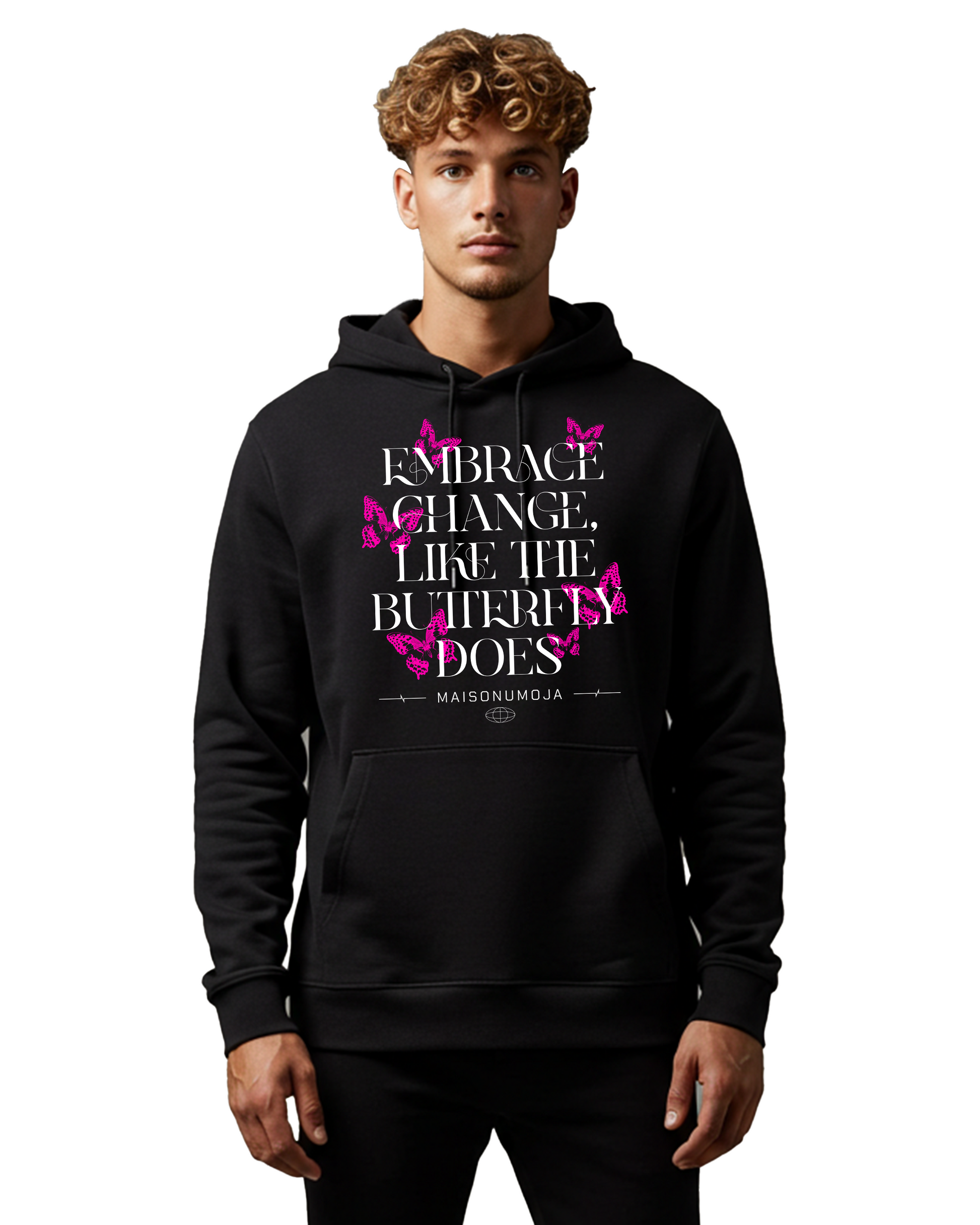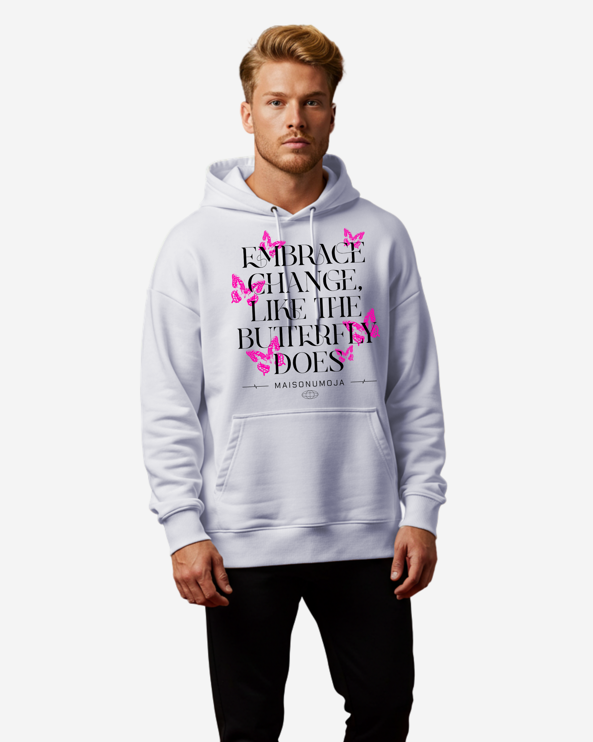 Embrace growth, transformation, and fearless self-expression with the Butterfly Elegant Oversized Hoodie, a design that embodies the beauty of change and personal evolution. Featuring delicate pink butterflies surrounding the inspirational phrase "EMBRACE CHANGE, LIKE THE BUTTERFLY DOES", this hoodie serves as a reminder that strength lies in adaptation and growth. The minimalist yet powerful typography amplifies the message of resilience, making it a statement piece for those who move with grace and determination.