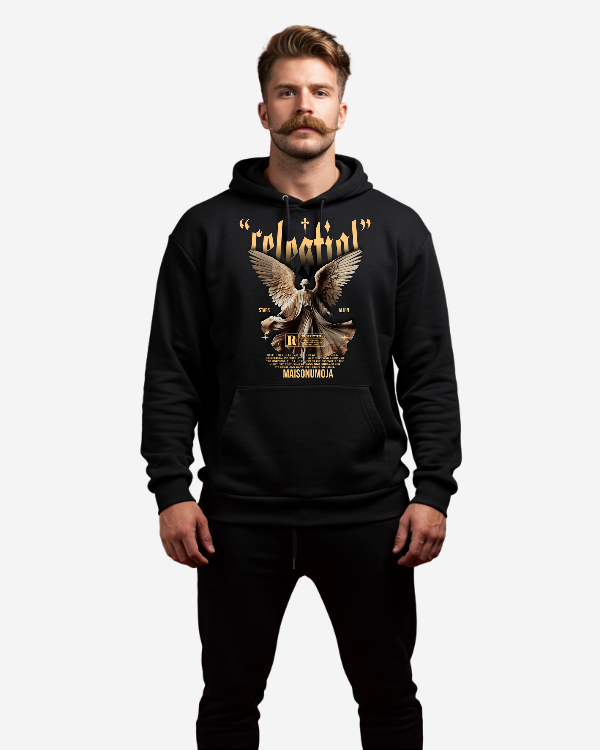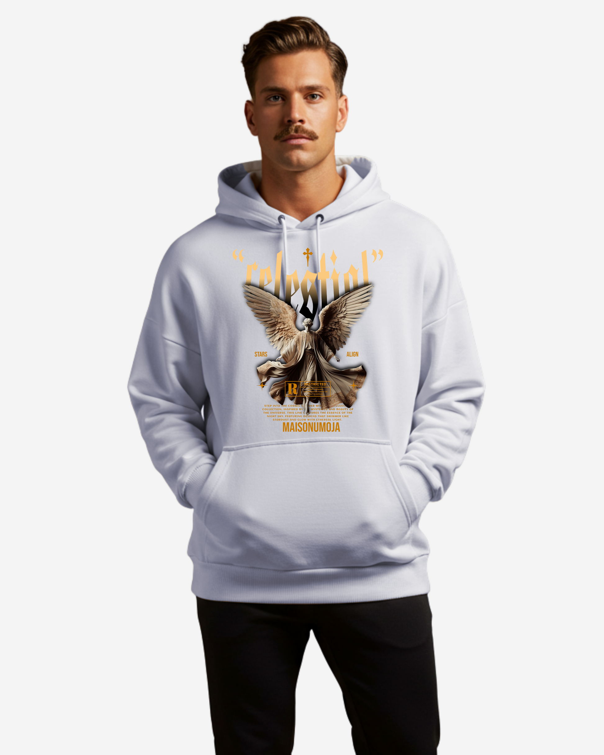 Step into the cosmic wonder of celestial energy with the Celestial Oversized Hoodie, a design that embodies mystery, divinity, and the vast beauty of the universe. Featuring a majestic angelic figure with outstretched wings, framed by the powerful words "Celestial", "Stars", and "Align", this hoodie represents spiritual elevation and universal connection. The intricate cross and ethereal typography reinforce the idea of cosmic balance and enlightened presence, making this a statement piece for those drawn to celestial aesthetics and symbolic storytelling.
