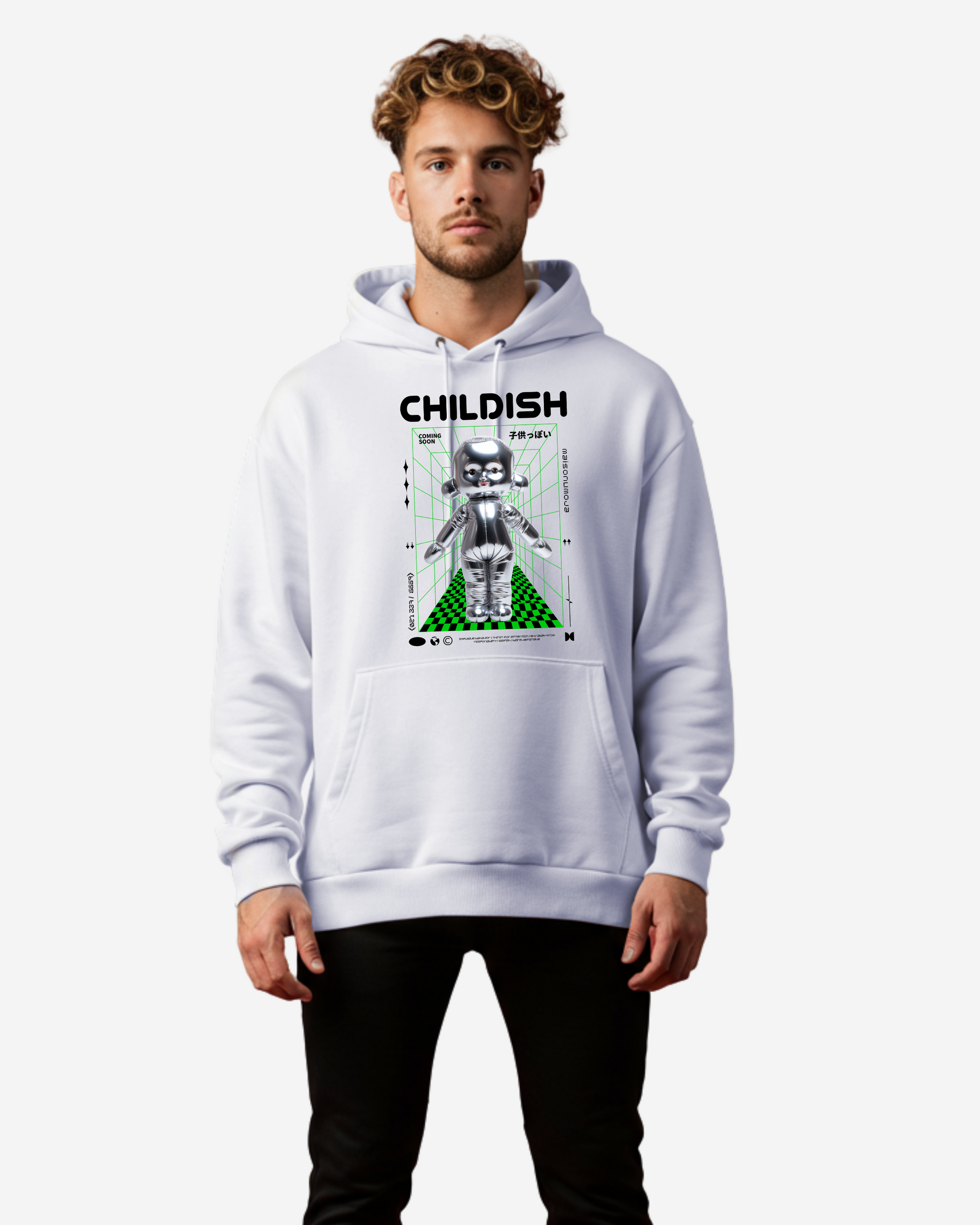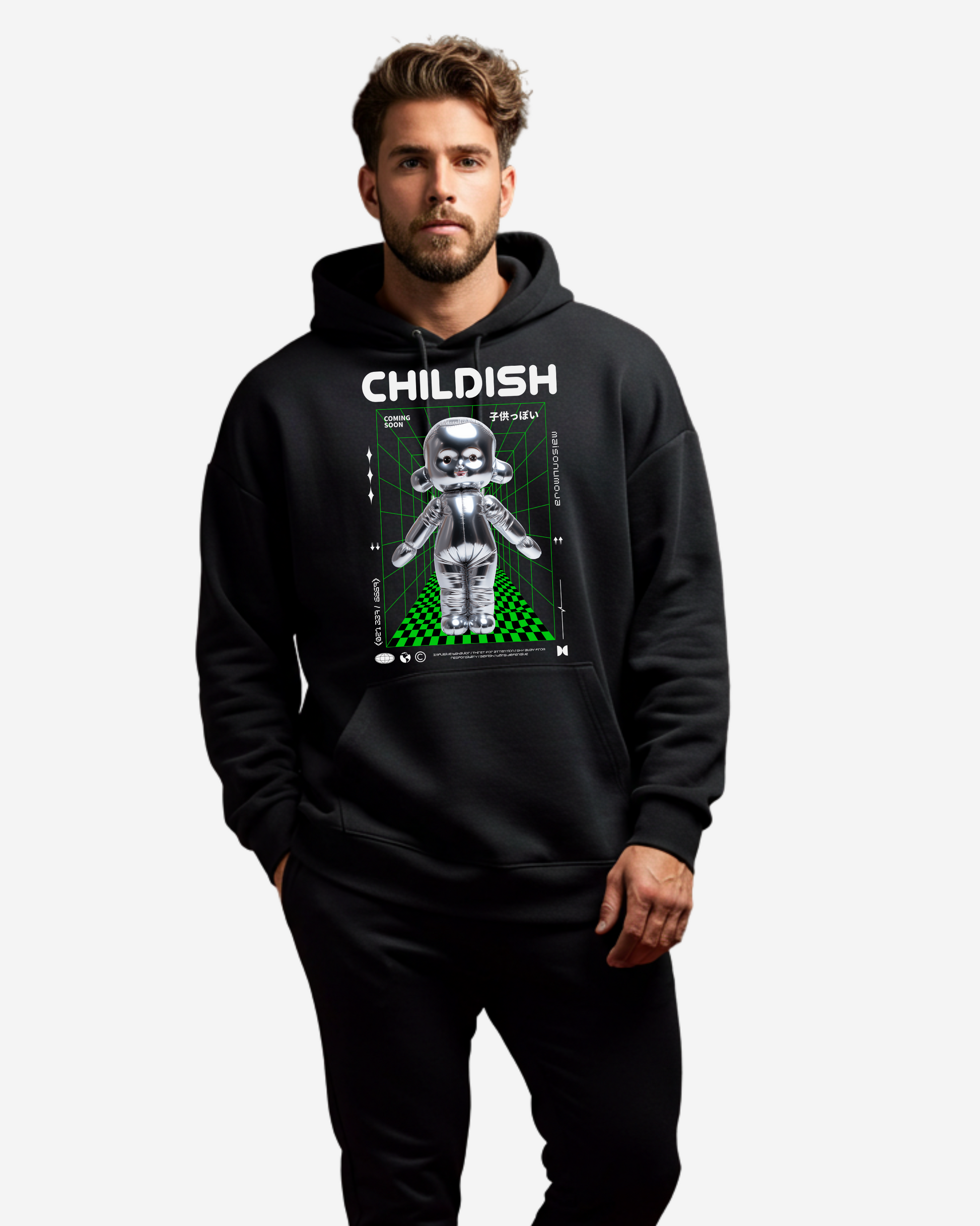 Embrace playful rebellion and futuristic energy with the Childish Oversized Hoodie, a design that embodies bold individuality and modern streetwear innovation. Featuring a metallic humanoid figure standing in a neon grid-patterned environment, this hoodie captures a fusion of retro-futurism and digital aesthetics. The striking “CHILDISH” typography, accompanied by Japanese text "子供っぽい", reinforces the theme of unapologetic creativity and youthful expression, making it a statement piece for those drawn to avant-garde design and bold urban fashion.