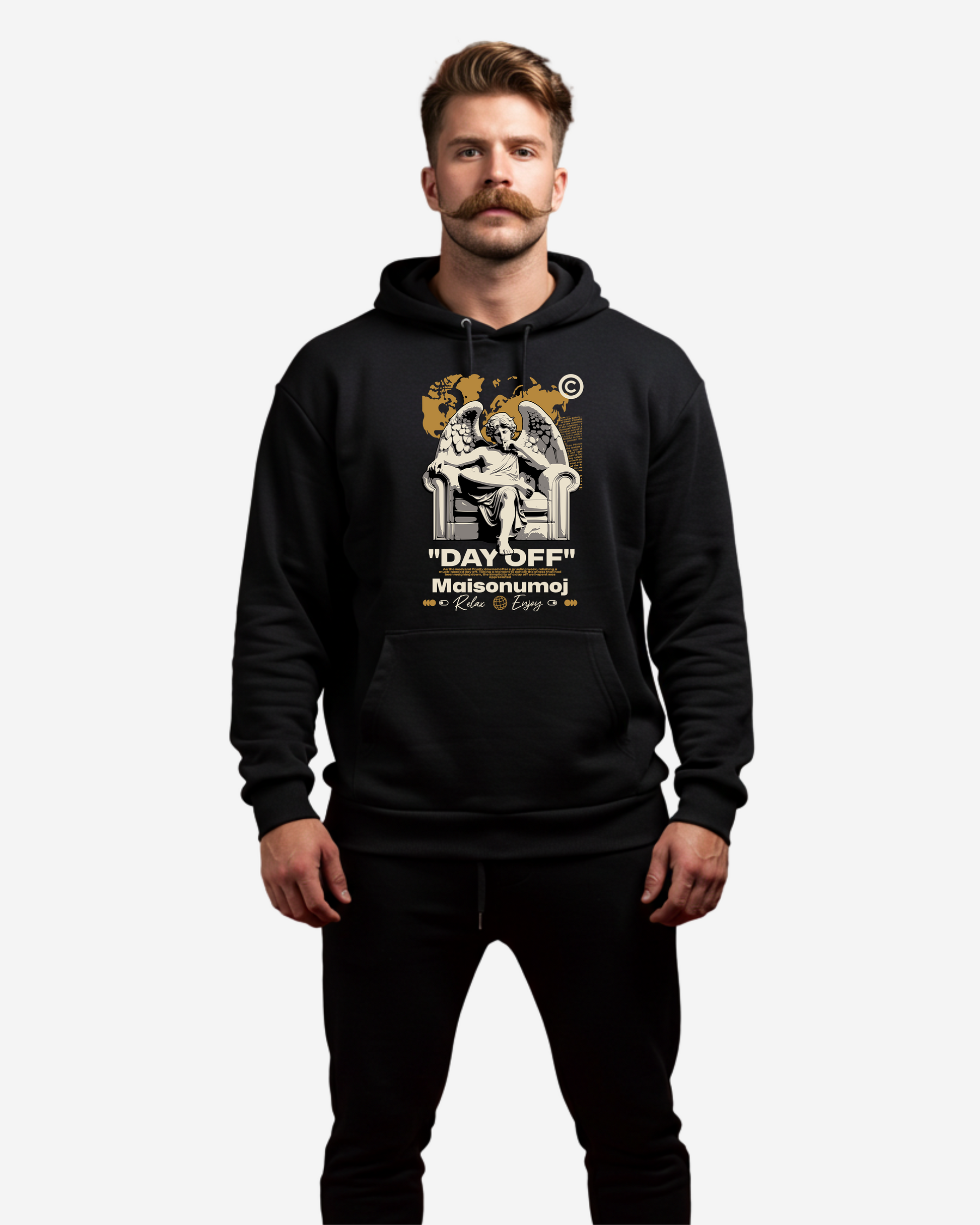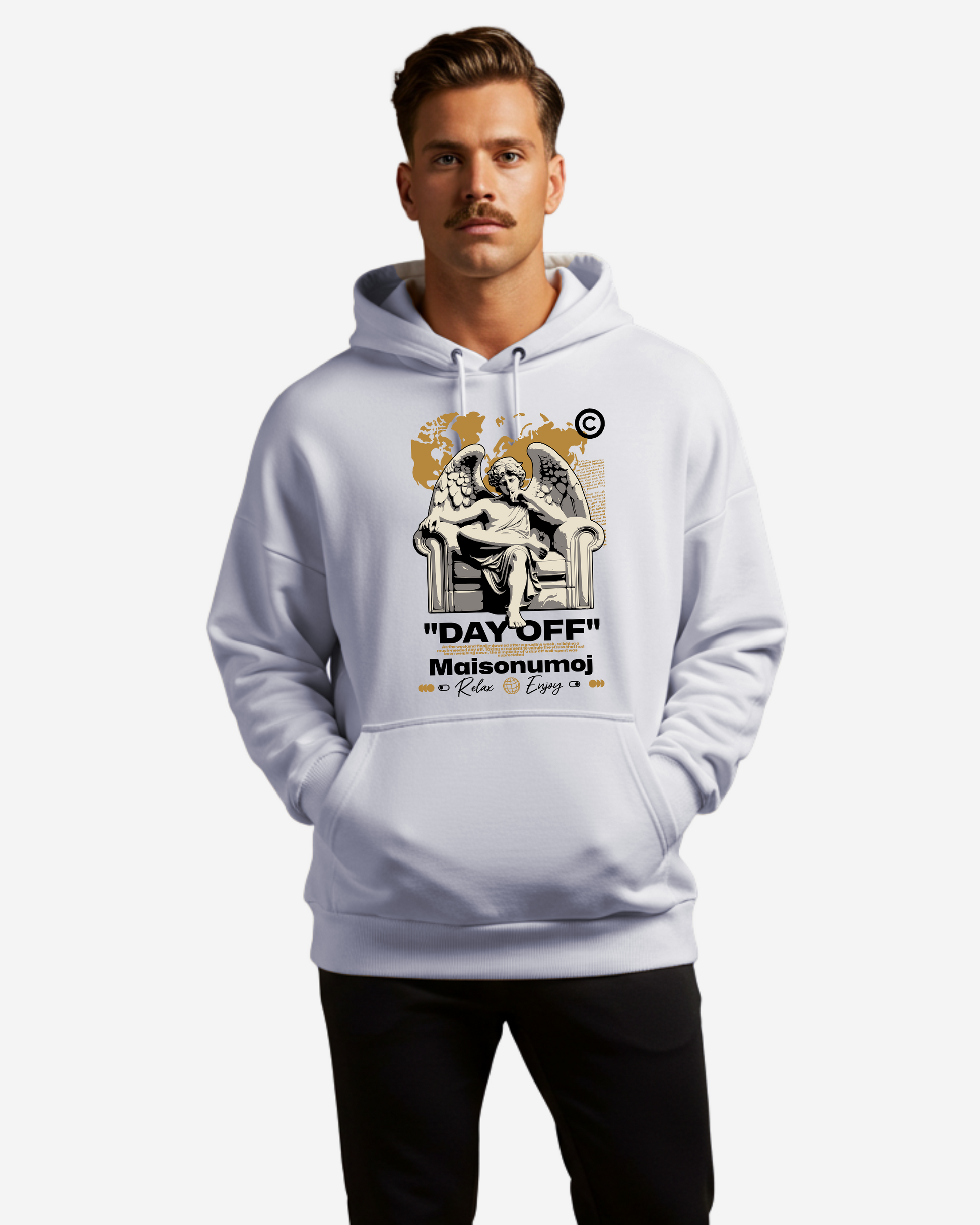 Embrace tranquility and effortless relaxation with the Day Off Oversized Hoodie, a design that captures the beauty of unwinding and taking time for yourself. Featuring a majestic angel statue resting on an armchair, this hoodie embodies a sense of reflection, calm, and appreciation for life’s pauses. The warm-toned world map in the background adds a subtle nod to the idea of escape, adventure, or finding peace wherever you are. The bold "Day Off" typography, paired with the phrase "Relax, Enjoy," reinforces the hoodie’s theme of well-earned rest and quiet moments.