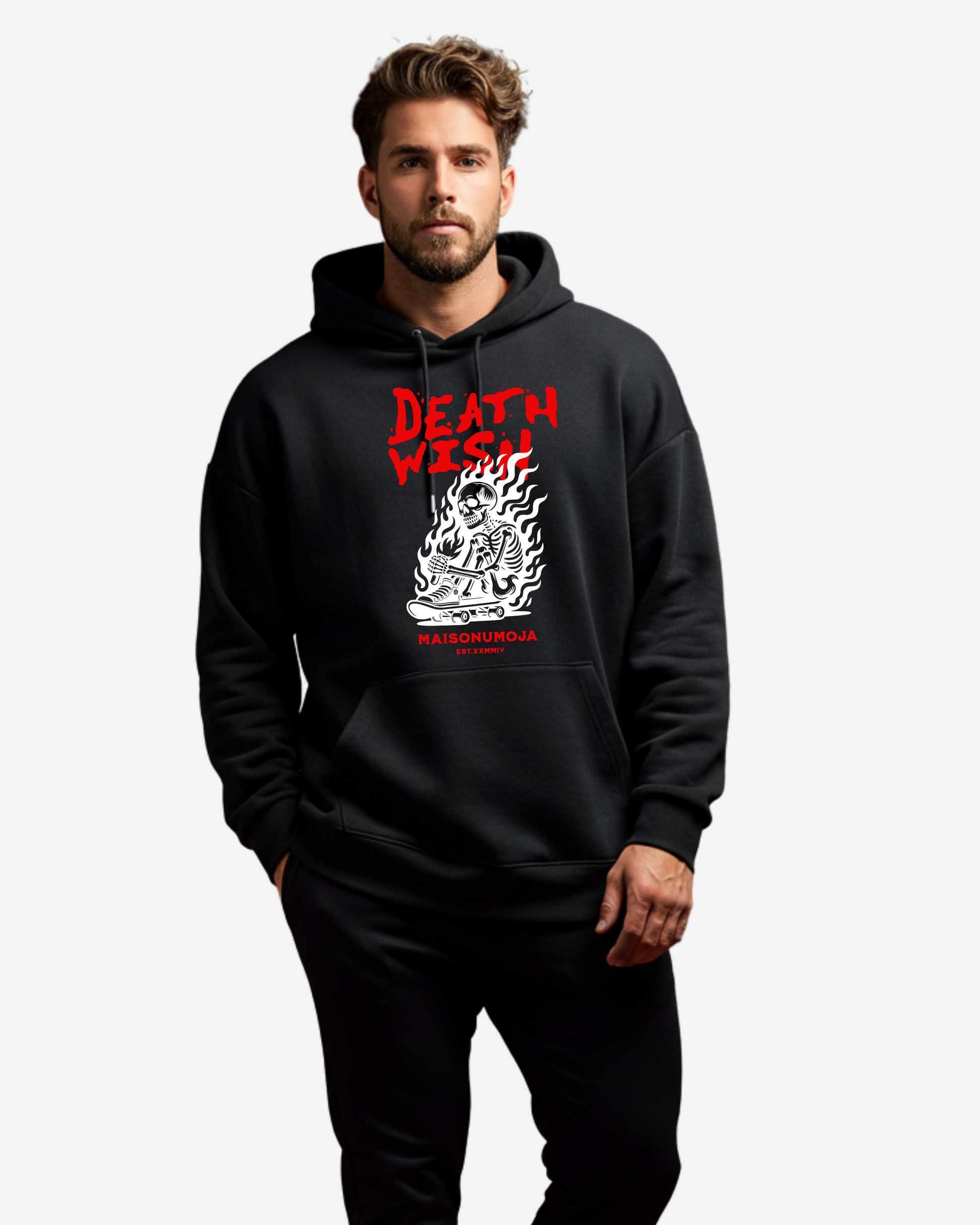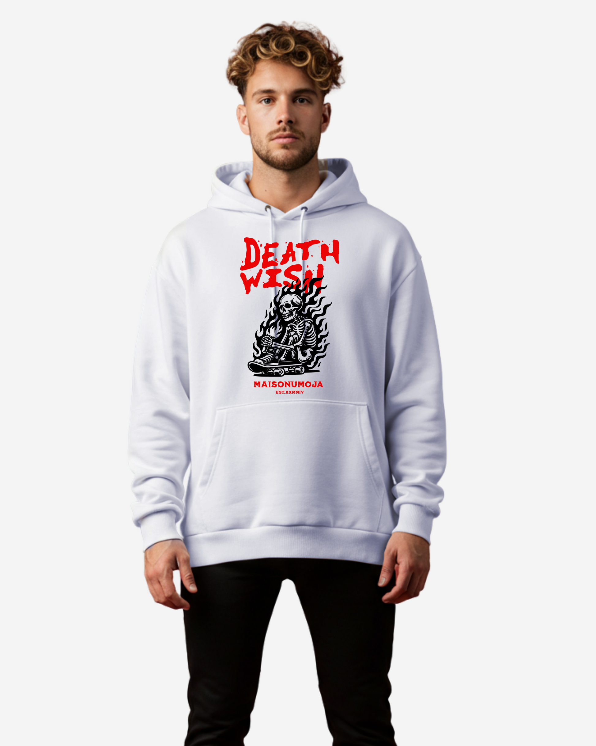 - Fiery “DEATH WISH” typography, enhancing the hoodie’s raw energy