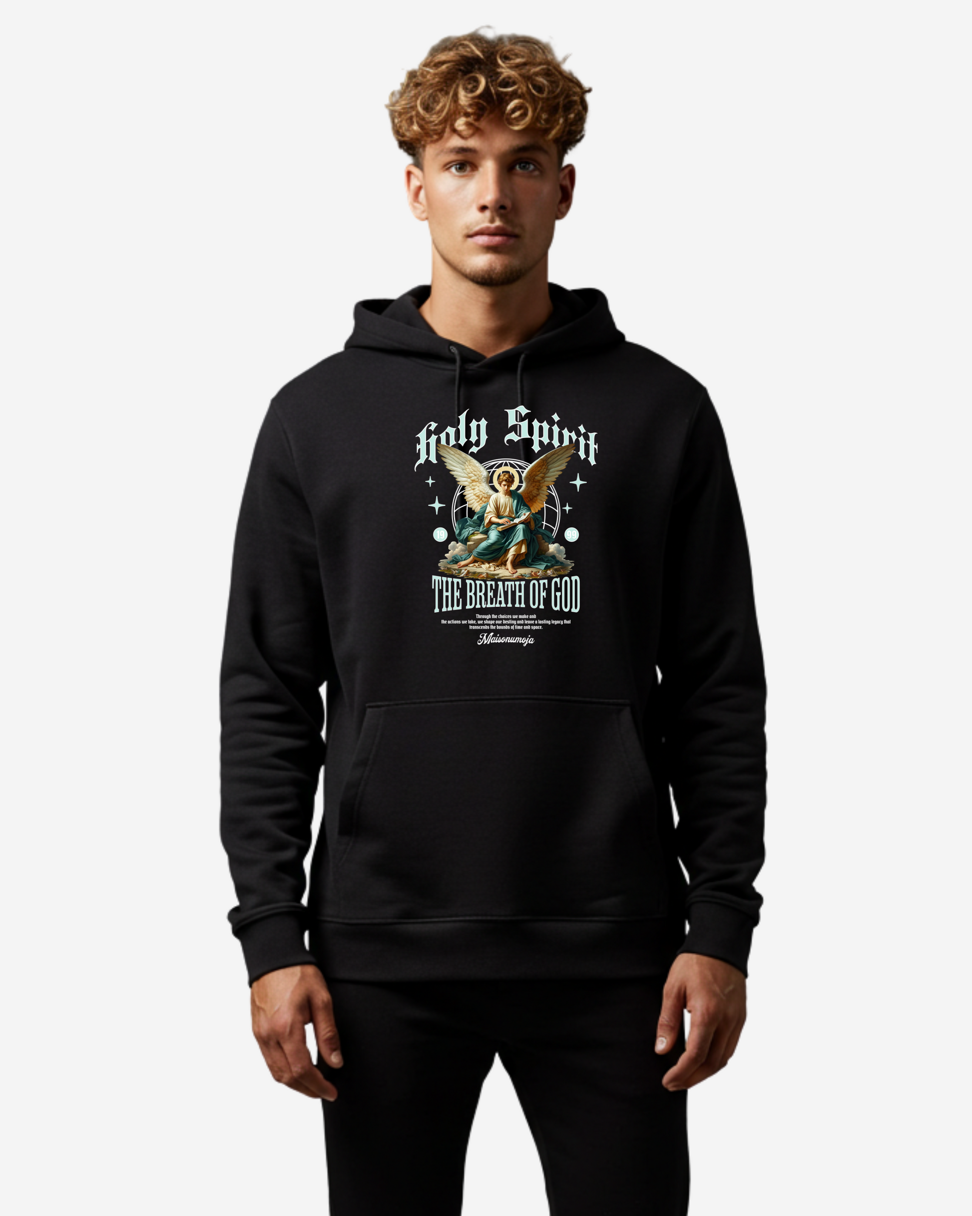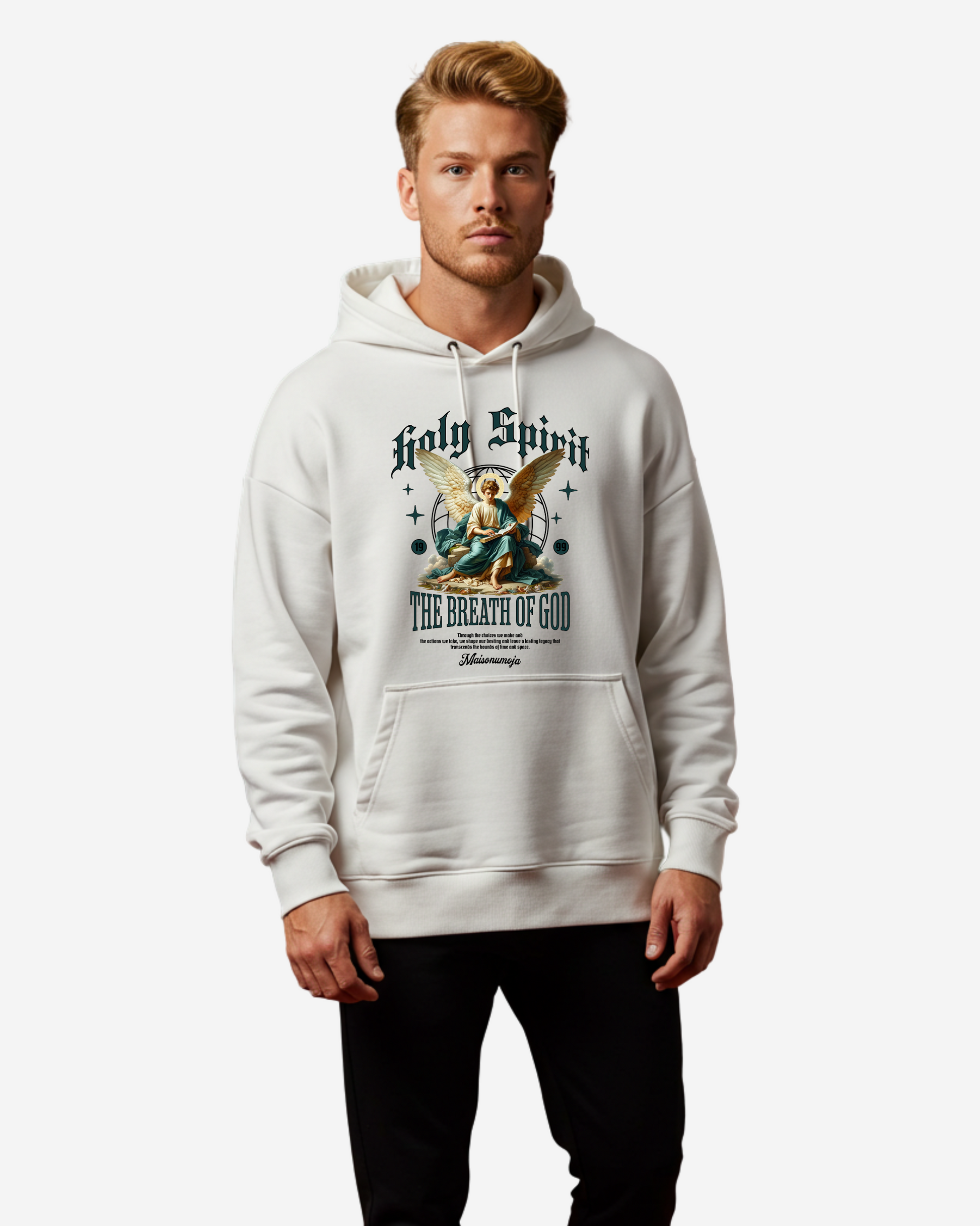 Step into divine wisdom and ethereal grace with the Holy Spirit Oversized Hoodie, a design that embodies faith, destiny, and the unseen forces that guide us. Featuring a majestic angel seated on celestial clouds, holding an open book, this hoodie symbolizes spiritual enlightenment, knowledge, and the timeless journey of human choices. The delicate halo and surrounding stars add an aura of transcendence, reinforcing the theme of divine presence and eternal legacy.