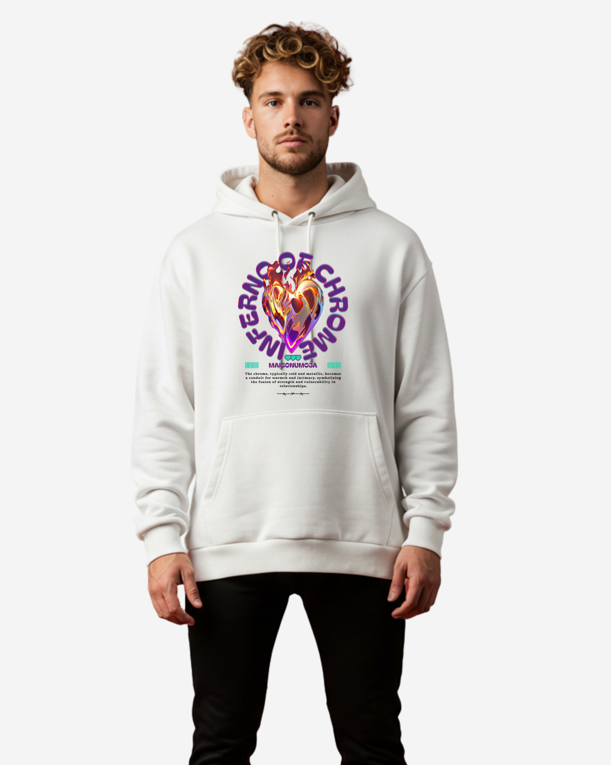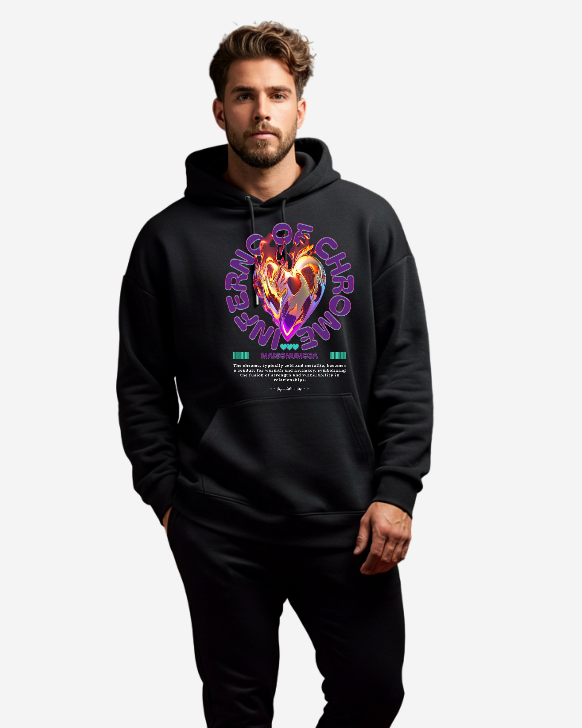 Step into the fusion of strength and emotion, where fire meets steel with the Inferno of Chrome Oversized Hoodie, a design that embodies raw energy, passion, and striking contrast. Featuring a bold chrome heart engulfed in flames, this hoodie symbolizes the intensity of relationships, the clash of cold metal and warm intimacy, and the balance between strength and vulnerability. The sleek “INFERNO OF CHROME” typography, curved elegantly around the blazing heart, reinforces the theme—love, resilience, and the transformative power of connection.