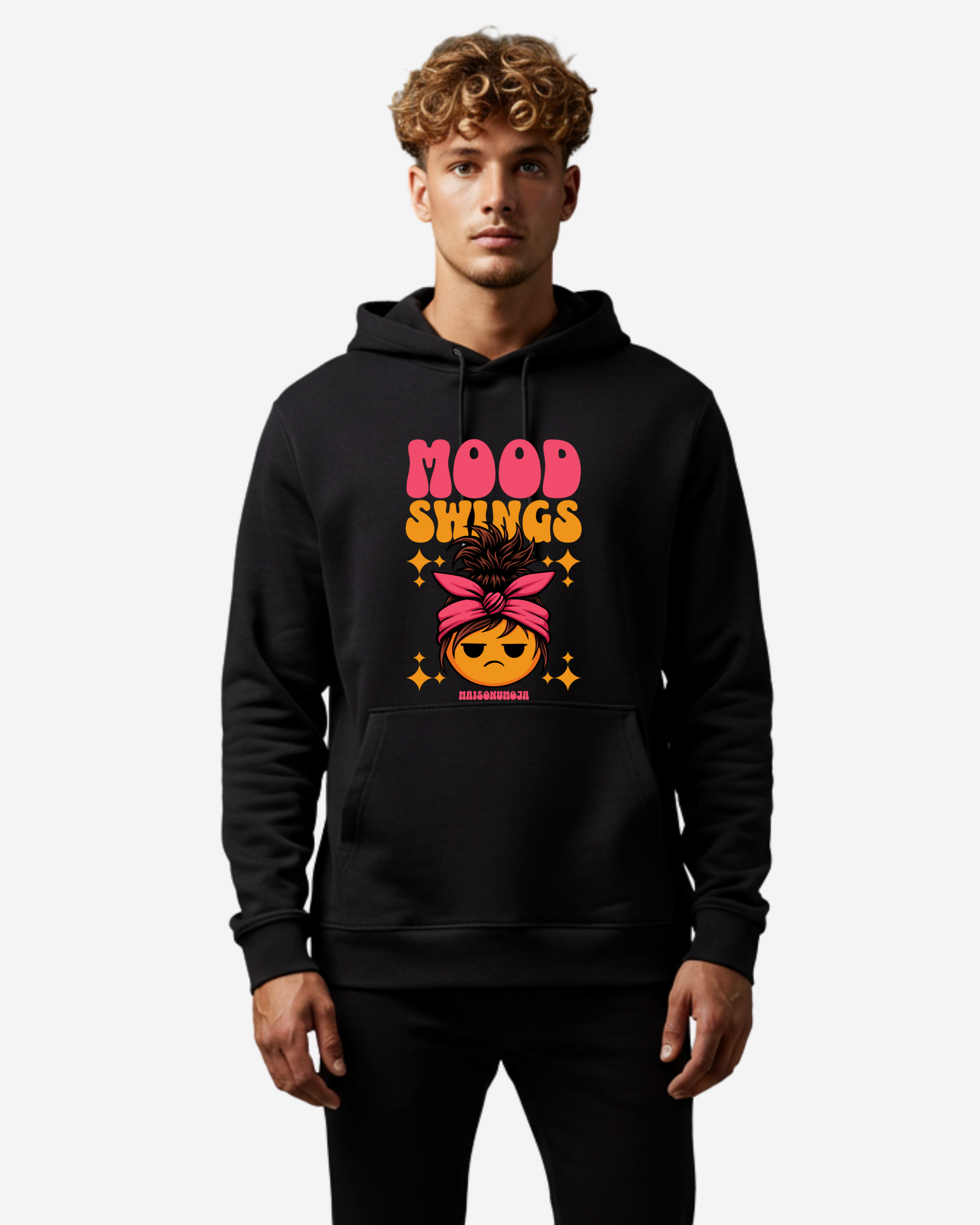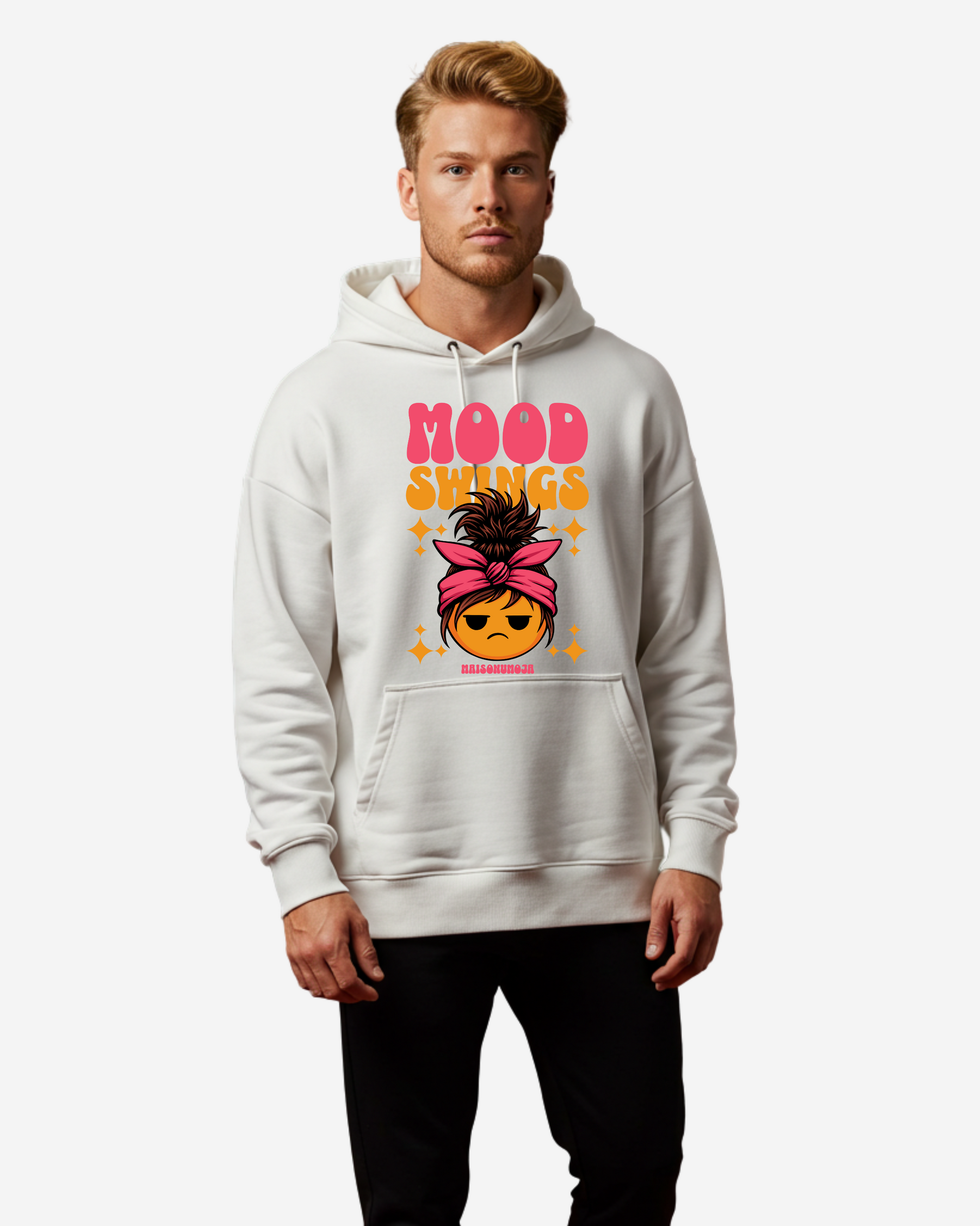 Step into playful unpredictability and unapologetic attitude with the Mood Swings Oversized Hoodie, a design that embodies shifting emotions, bold self-expression, and effortless style. Featuring a cartoonish emoji with a frowning face, rocking a pink headband and messy bun, this hoodie humorously captures the ups and downs of mood swings with a visually striking and relatable aesthetic. The vibrant “MOOD SWINGS” typography, in bold pink and orange, amplifies the theme—a nod to the ever-changing emotions we all experience.