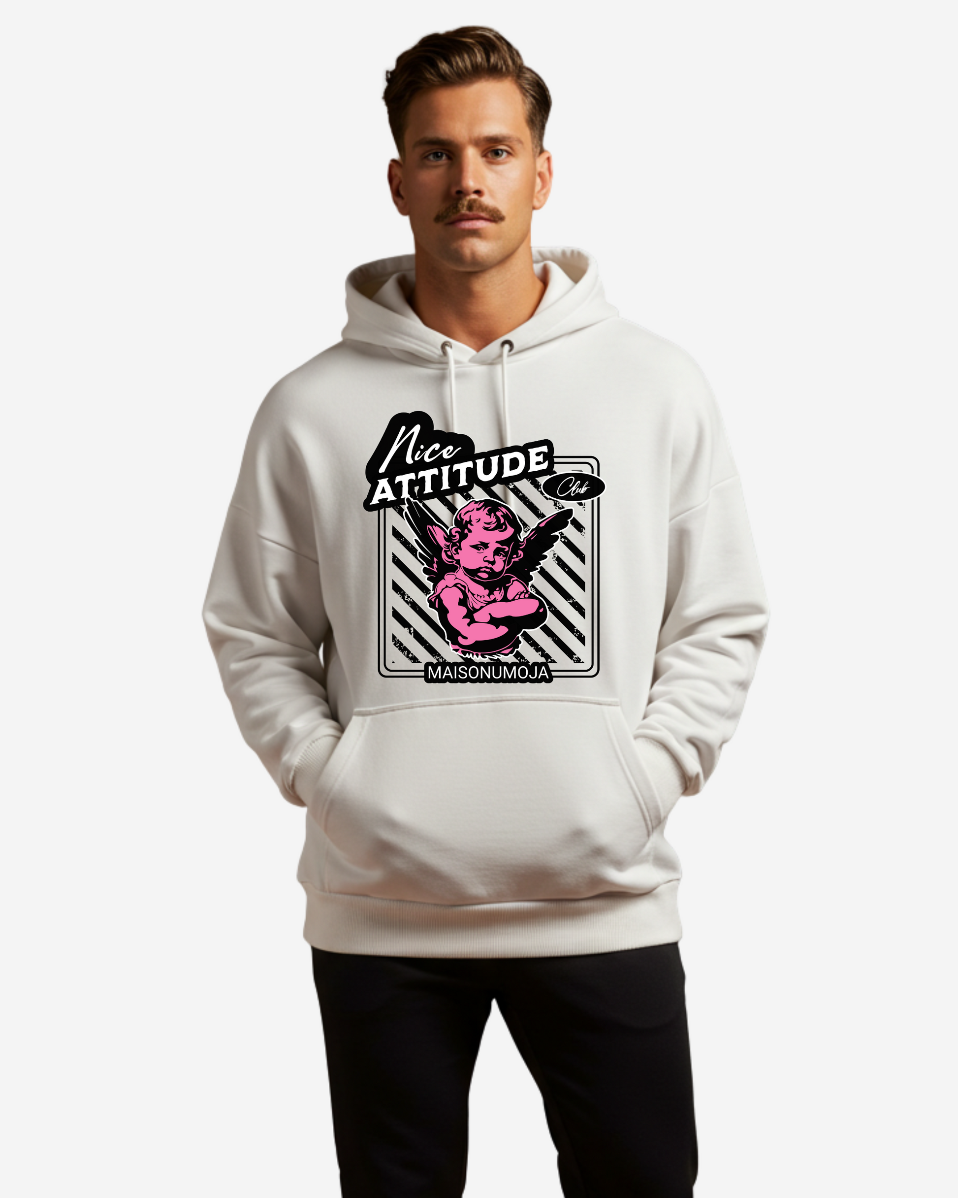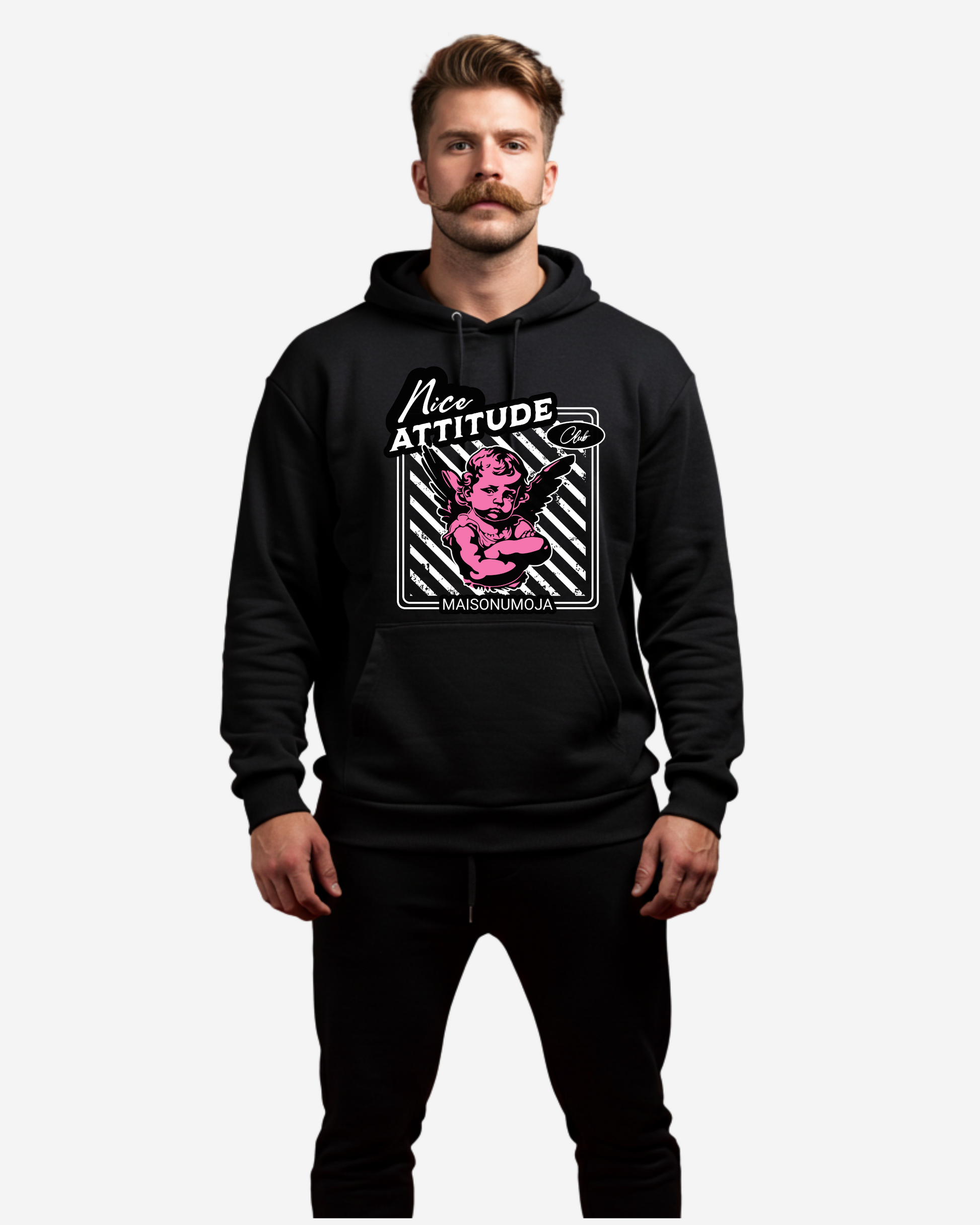 The Nice Attitude Oversized Hoodie blends bold expression with a stylish edge. Featuring a pink cherub with wings, arms crossed in confidence, and set against black diagonal stripes, this design captures attitude with a rebellious yet artistic touch. The dynamic mix of cursive and block-letter typography enhances its statement-making presence.