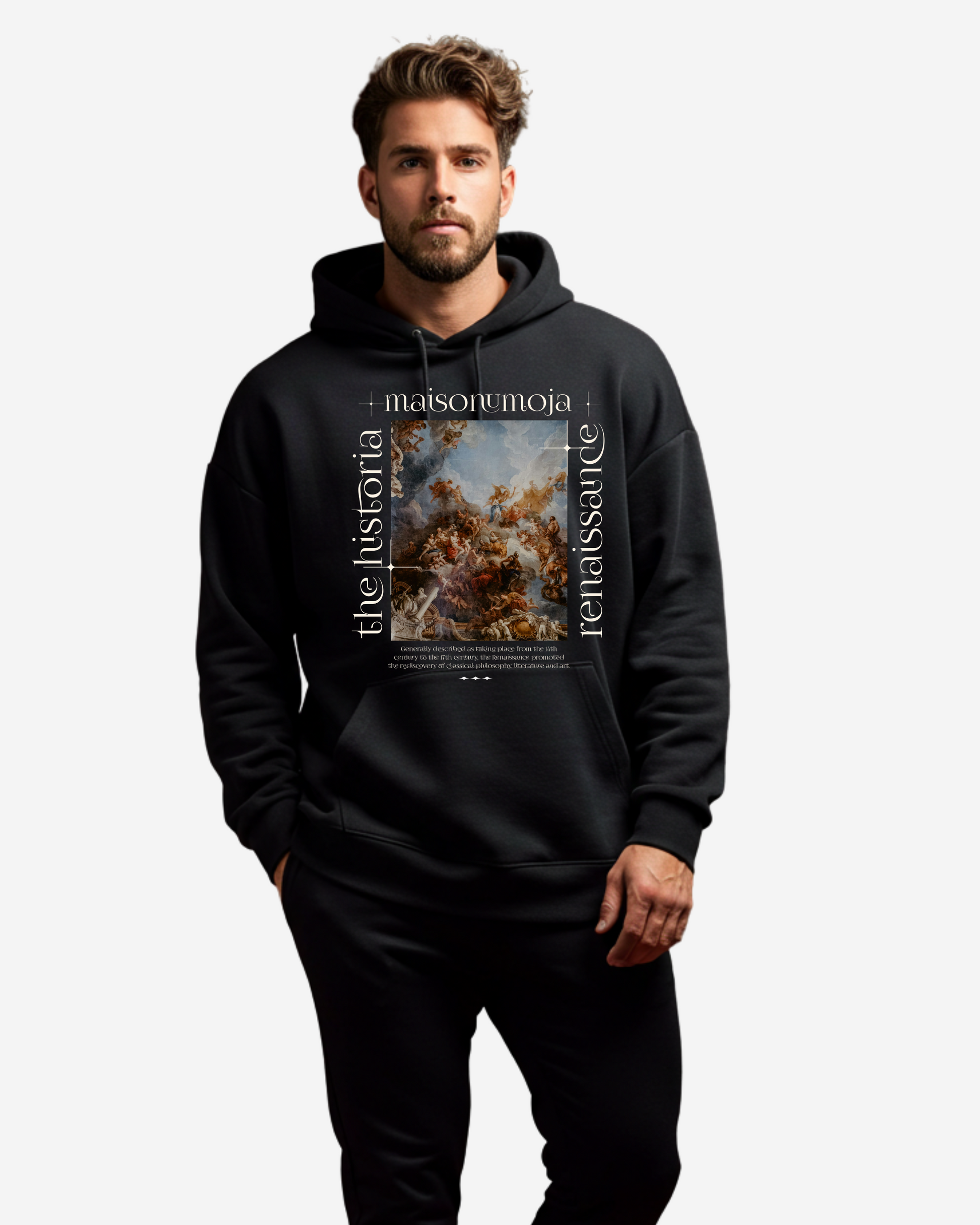 The Renaissance The Historia Oversized Hoodie celebrates the grandeur and artistic mastery of the Renaissance era. Featuring a breathtaking ceiling fresco filled with angelic figures, mythological beings, and dynamic movement, this design embodies timeless storytelling and classical artistry.