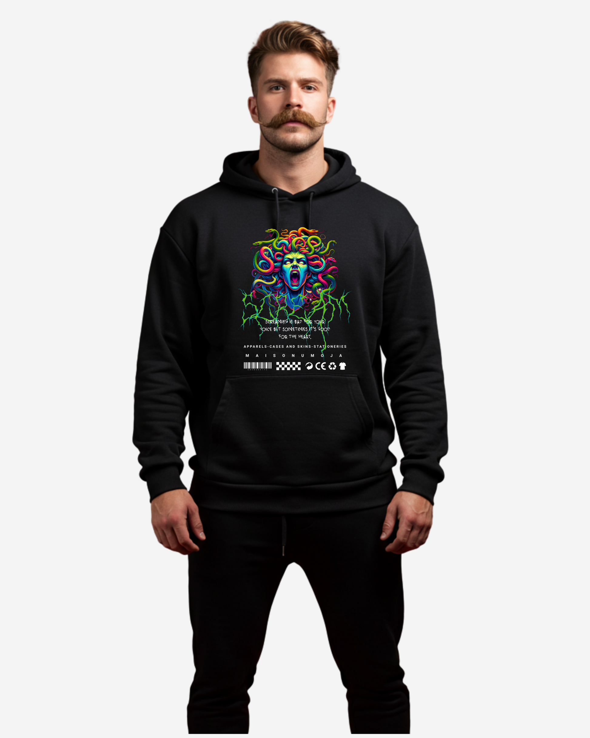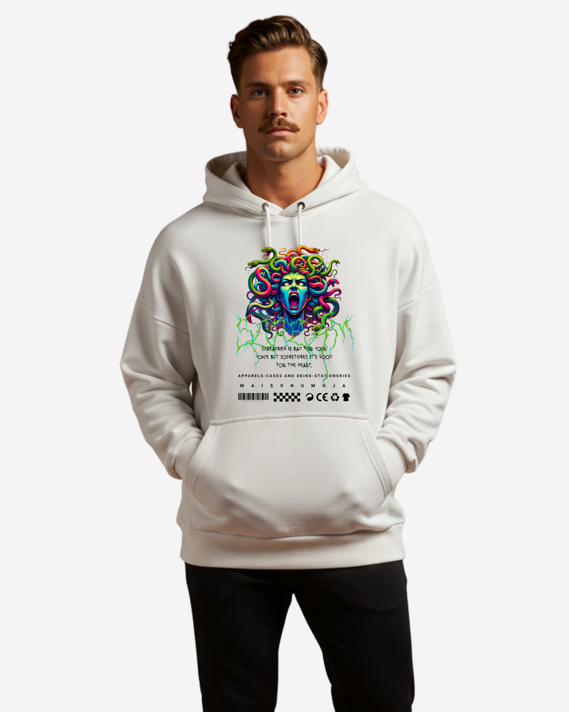 The Screaming Oversized Hoodie merges raw energy with intricate artistic detail. Featuring multiple vibrant snakes intertwined, their fangs bared in striking aggression, this design embodies primal force and untamed chaos. The neon green lightning streaks intensify its bold, electrifying presence.