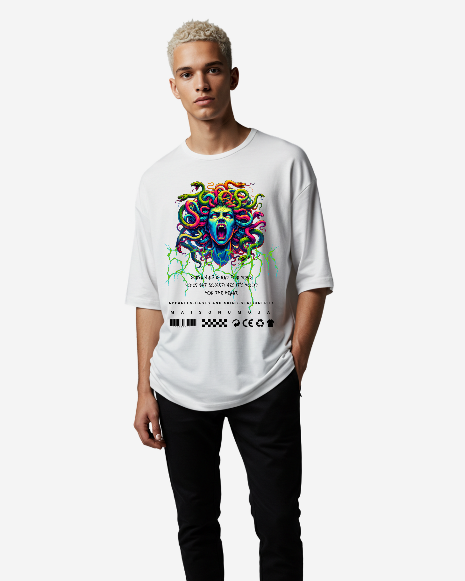 Turn up the volume with the Screaming Oversized T-Shirt. Featuring an intense graphic that captures unfiltered emotion, this tee brings bold energy to a relaxed oversized fit. Crafted from 100% soft, breathable cotton, it’s made for those who express without limits.