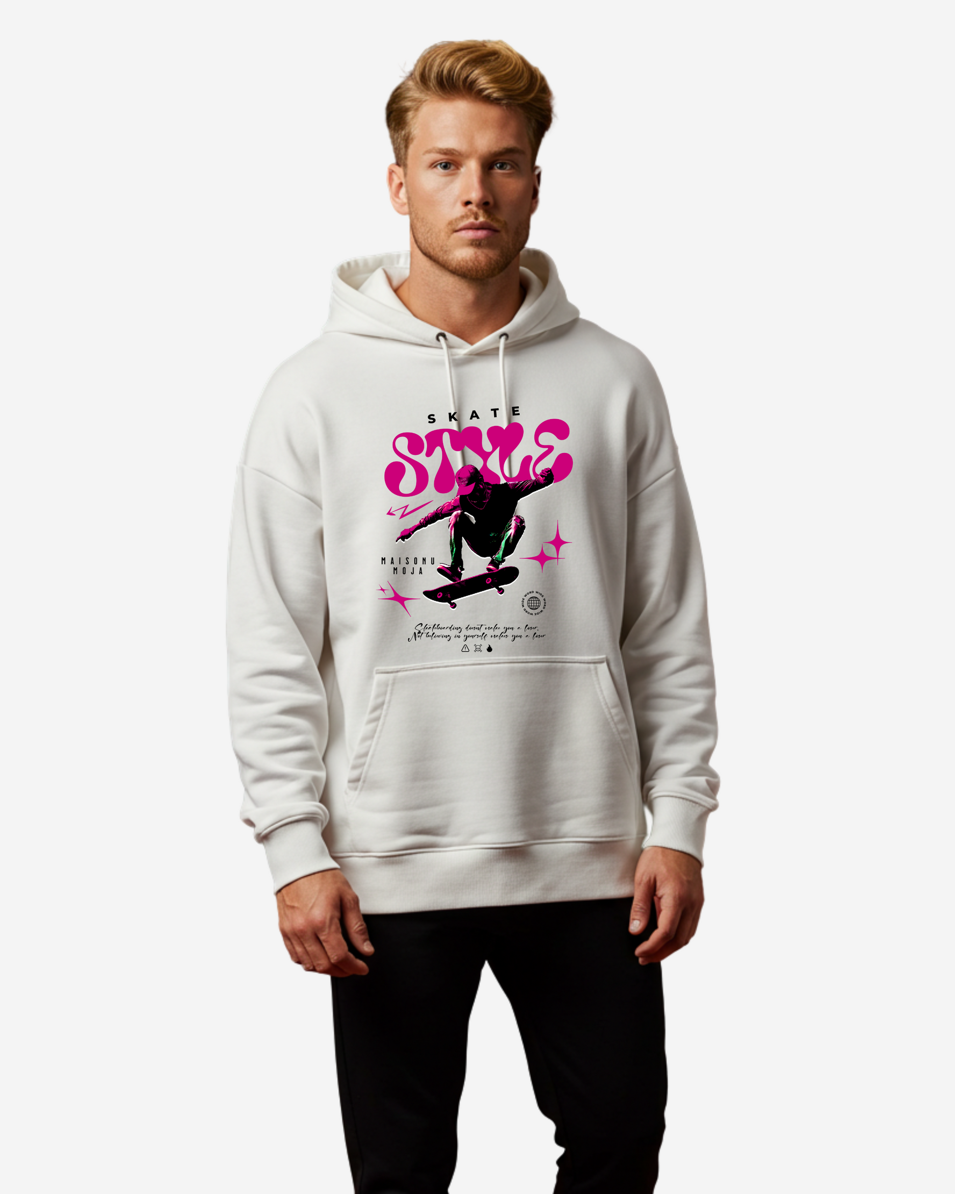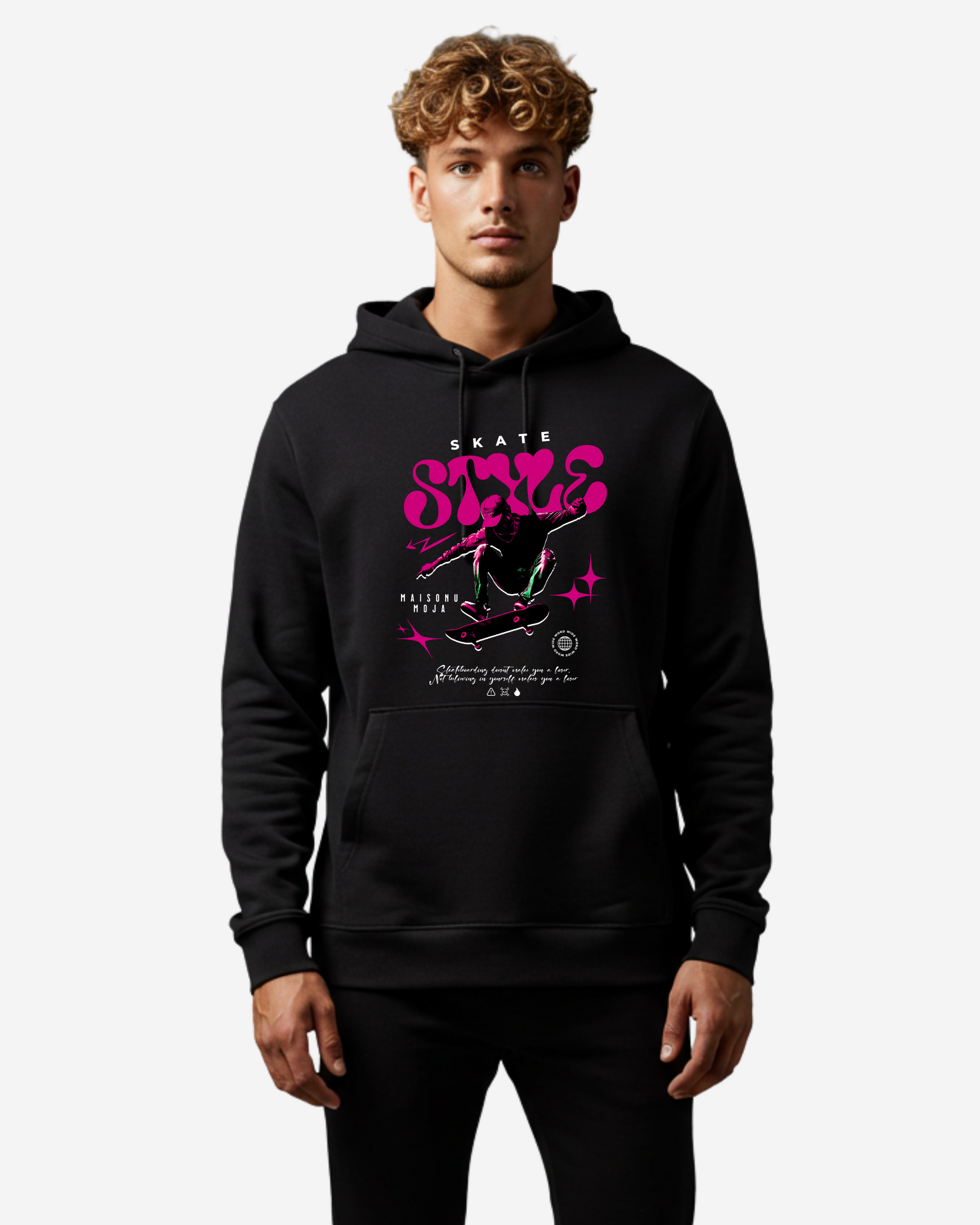 The Skate Style Oversized Hoodie captures the high-energy essence of skateboarding culture with a dynamic, mid-air trick performance. Featuring a skateboarder in black and pink tones against a bold, this design embodies movement, confidence, and urban attitude.