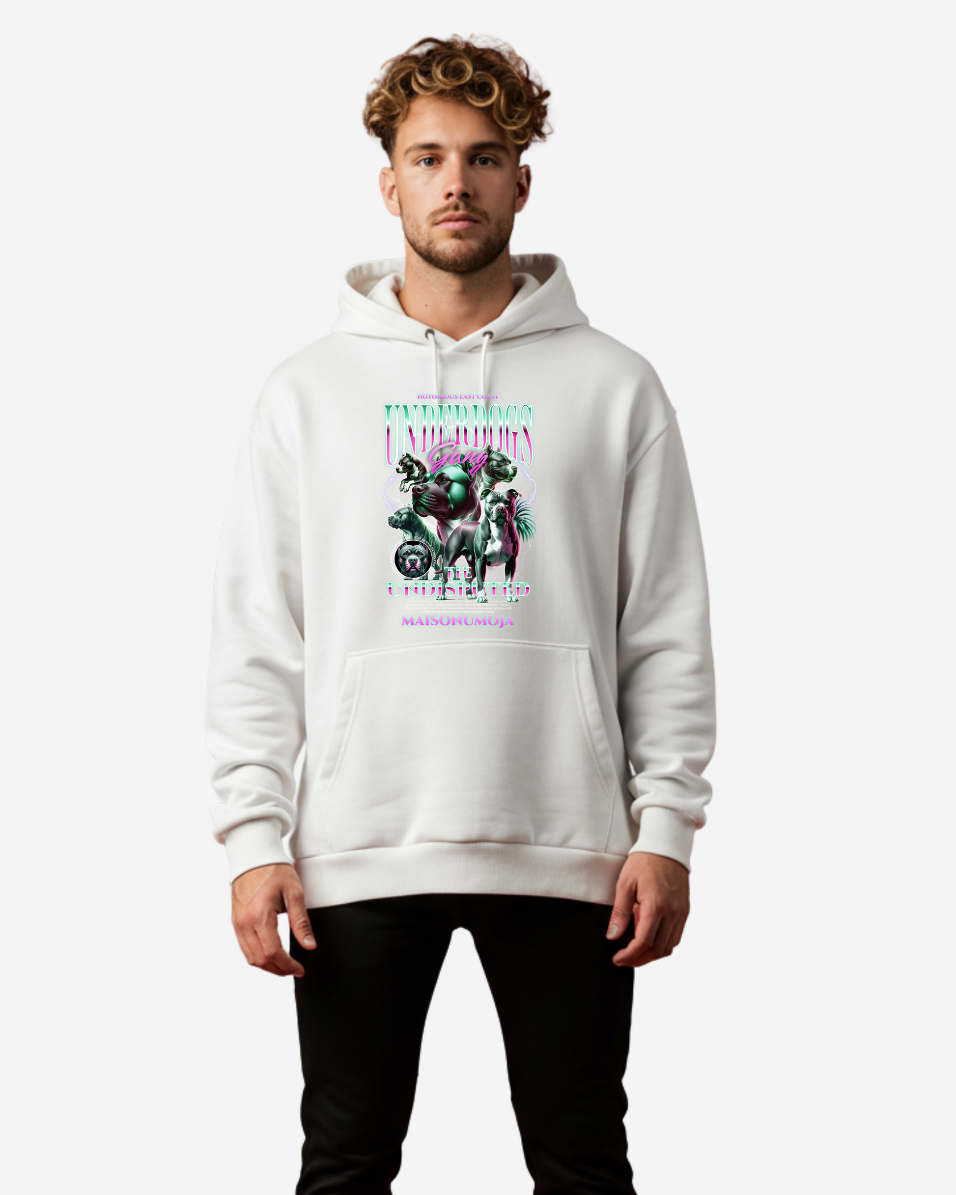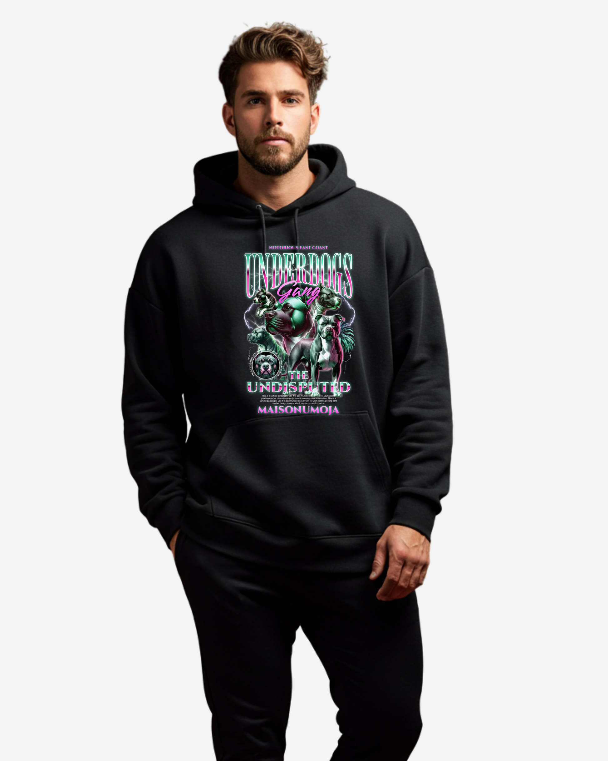 The Underdogs Gang Oversized Hoodie celebrates resilience and unity, embodying the spirit of defiance and loyalty. Featuring a bold neon illustration of muscular pit bulls, this design conveys raw strength and determination. The powerful typography, “NOTORIOUS EAST COAST UNDERDOGS GANG,” reinforces the hoodie’s unapologetic street presence.